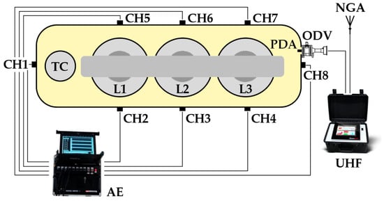 Figure 3. Schematic diagram of the online PD monitoring conducted simultaneously using the acoustic emission (AE) and ultra-high-frequency (UHF) methods: CH1–CH8—acoustic emission sensors; L1, L2, and L3—windings of individual transformer phases; TC—on-load tap changer; ODV—oil drain valve; PDA—Qualitrol CMD01591 rod antenna; NGA—external noise-gating antenna; AE—acoustic emission measurement system (PDtracker Portable); UHF—ultra-high-frequency measurement system (Qualitrol Portable PDM). - Step 6.