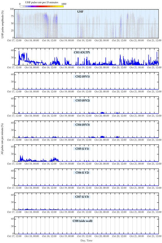 Results of online PD monitoring for ‘Transformer A’ recorded between 17 and 21 October 2023: amplitude and count of UHF pulses, along with the count of acoustic emission pulses detected by eight AE sensors.