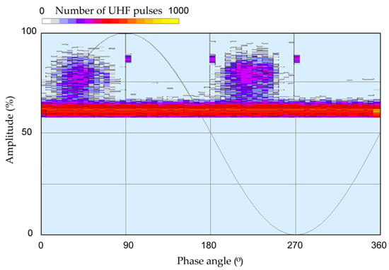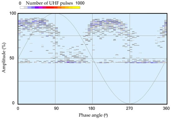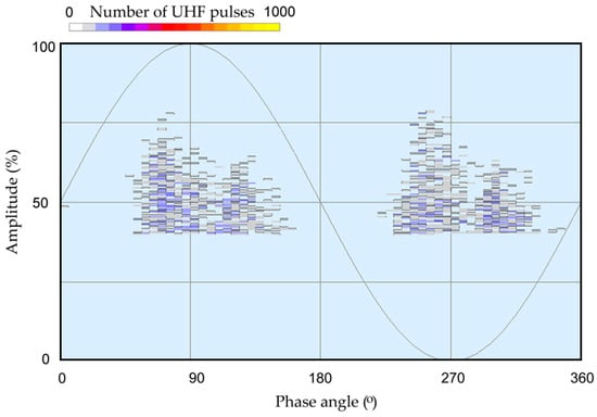 PRPD pattern of UHF PD pulses recorded on 27 May 2024, at 1:46 p.m., in the tested ‘Transformer C’.