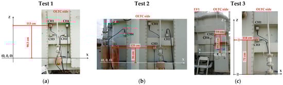 Photographs of the tank of ‘Transformer A’ with installed AE sensors and the Cartesian coordinate system adopted for PD source localization using the TDoA technique: (a) Test 1, (b) Test 2, and (c) Test 3.