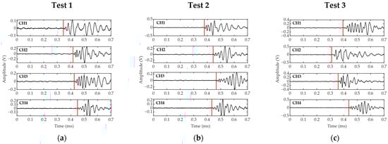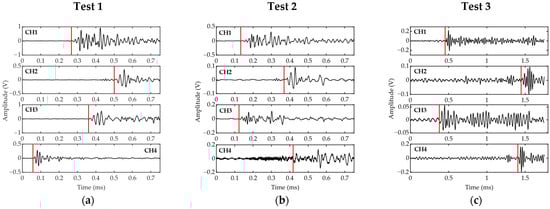 AE time waveforms with the pulse onset marked (red line) and estimated using the AIC method and recorded during measurement tests on ‘Transformer A’: (a) Test 1, (b) Test 2, and (c) Test 3.