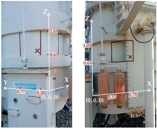Based on information obtained from the AE monitoring, it was determined that the PD source was most likely located near the on-load tap changer. Therefore, the localization procedure was confined to this area (the side wall of the transformer tank). To pinpoint the PD source using the TDoA technique, pulses were recorded using four AE transducers in three different configurations of their positions, referred to as Test 1, Test 2, and Test 3. A common Cartesian coordinate system, shown in Figure 6, was adopted for all tests.