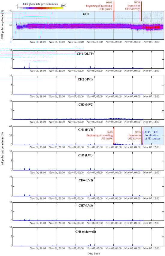 Figure 4 presents the results of UHF signal and acoustic emission (AE) recordings obtained simultaneously by eight AE transducers mounted on the tank of the tested transformer. Both systems were activated on 17 October 2023, at 3:00 p.m., and from the moment of activation, a high intensity of PD was observed. In the case of PD testing using the AE method, the maximum number of pulses recorded by the CH1 transducer, positioned near the on-load tap changer, was 4660 pulses per minute, representing approximately 60% of the measurement channel capacity. During the first two days of operation of the monitoring system, moderate intensity AE pulses were also recorded by the CH5 transducer, installed near the L1 phase on the low-voltage side. The remaining AE transducers either did not register any pulses or recorded pulses of low intensity. In the case of PD testing using the UHF method, the system recorded numerous pulses with very high amplitudes, reaching 90% of the maximum value of the measurement range. Periods of high and moderate AE and UHF pulse activity predominated in the monitored transformer, while instances of complete signal loss were observed extremely rarely. It is noteworthy that the periods of highest AE and UHF pulse activity largely overlapped, suggesting that their common source was a defect in the insulation system generating PDs.