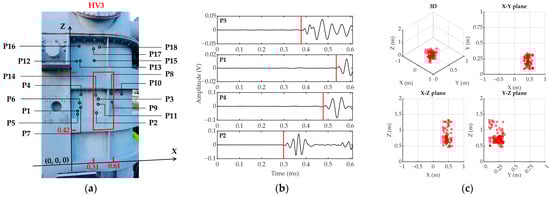 (a) Photograph of a fragment of the ‘Transformer B’ tank, showing a Cartesian coordinate system applied for PD source localization using the TDoA method, with 18 measurement points marked where AE transducers were installed, as well as the solution area (red rectangle); (b) representative AE waveforms recorded at measurement points P1, P2, P3, and P4, with the onset times of the pulses marked by red lines; and (c) a graphical representation of the PD source localization results.