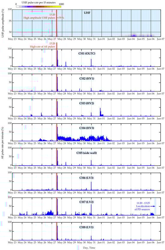 Figure 13 shows the results of two weeks of monitoring conducted on ‘Transformer C’ from 23 May 2024 to 6 June 2024. Three hours after the transformer was switched into operation in measurement channel CH7 (with the transducer positioned opposite the L2 phase on the lower voltage side), the acoustic emission system suddenly began recording stable pulses of moderate intensity, registering 1079 pulses per minute—approximately 14% of the channel’s capacity. From that moment, that is, from 23 May, 6:23 p.m., to 24 May, 2:15 p.m., the system practically continuously recorded AE pulses of variable intensity (from 0.2 to 21%).
