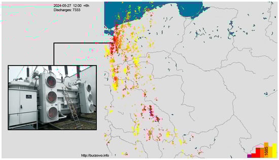 Map of lightning discharges recorded on 27 May between 12:00 and 18:00 (total: 7333 discharges), with the location of the tested power transformer highlighted. Data source: https://burzowo.info/archiwum (accessed on 18 January 2025).