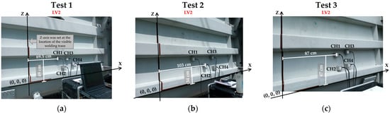 Photographs of the tank of ‘Transformer C’ with installed AE sensors and the Cartesian coordinate system adopted for PD source localization using the TDoA technique: (a) Test 1, (b) Test 2, and (c) Test 3.
