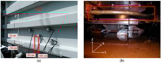 PD source location in ‘Transformer C’: (a) area on the tank showing the calculated range of X and Z coordinates for the PD source; (b) a photograph of a sister unit showing the low-voltage winding lead (marked with a red rectangle), the position of which aligns with the calculated coordinates of the PD source.