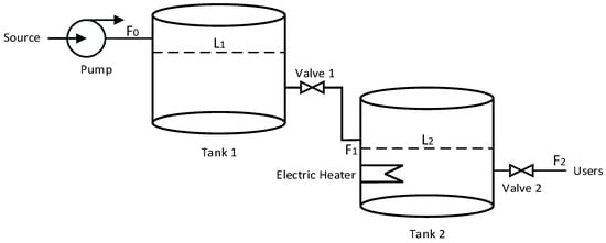This paper uses a dual-tank system as a case study to illustrate the principles of modeling and reasoning using an MFM. The design purpose of the dual-tank system is to provide a stable hot water supply with its temperature maintained at a preset value. As shown in Figure 2, the system consists of two interconnected tanks: Tank 1 and Tank 2. These tanks work in coordination to optimize the water heating and management, ensuring the stable operation of the system.