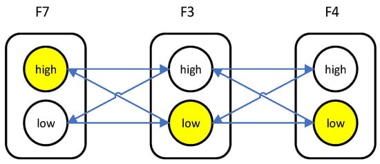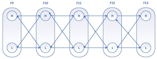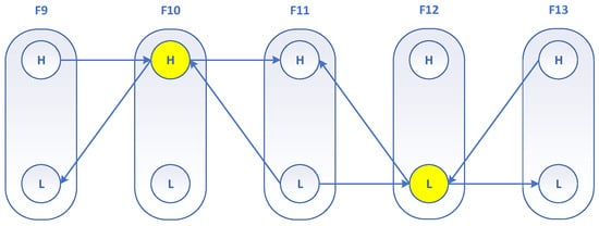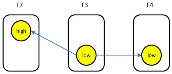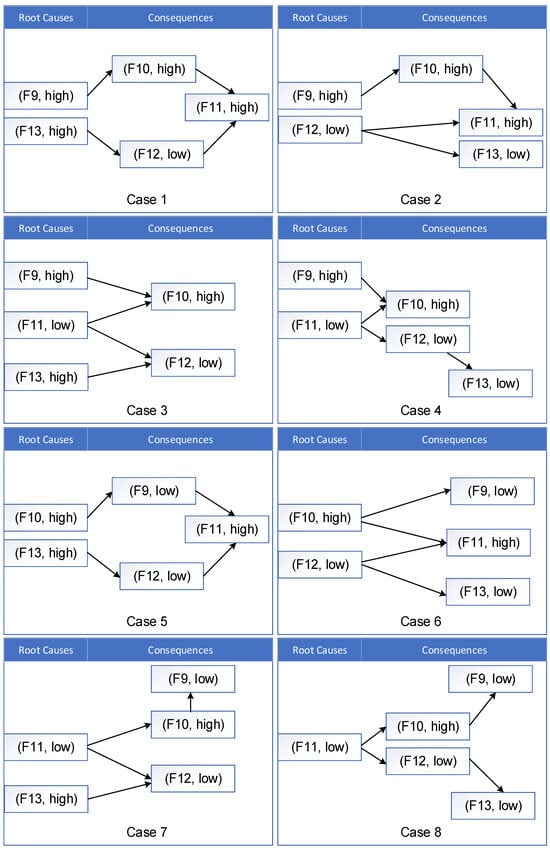 However, when diagnosing faults, it is crucial to consider other potential causes in order to fully explain the system anomaly. Table 3 provides various interpretations of case scenarios formed by different combinations of functional states acting as root causes. These interpretations are illustrated in Figure 9 [33]. While the low state of F11 may still play a significant role in the system behavior, it is important to recognize that other faults must be considered together to form a comprehensive explanation of the root cause. Notably, even though F13 (high) needs to be considered in conjunction with other faults to form a complete scenario explanation, it is worth emphasizing that F13 (high) accounts for 50% of the total of eight fault scenarios in Cases 1, 3, 5, and 7. Therefore, this fault mode is highly significant and should not be overlooked.