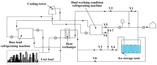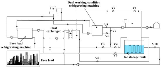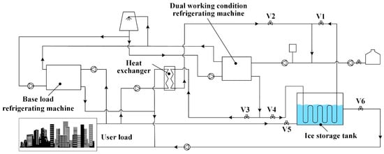 When the internal ice melting method is used for cooling, the high-temperature heat transfer fluid, which has been heated by the air conditioning load, circulates through the coil. The ice on the outside of the tube melts from the inside out to provide the cooling load [32]. Figure 2 illustrates the operational mechanism of the internal ice melting system. The system comprises a base load refrigerating machine, a dual-working-condition refrigerating machine, a heat exchanger, a coil, an ice storage tank, a cooling tower, and other pumps and valves [33,34].