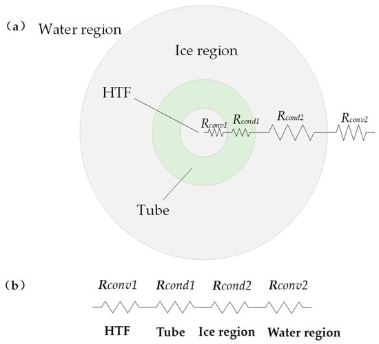 (a) Schematic diagram of the heat transfer process in the ice storage unit; (b) Thermal resistance diagram.