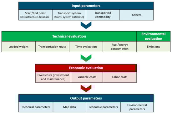 Current studies and models for multimodal transport are primarily based on optimization, most often focusing on general cost minimization or, more often, also assessment of emissions (particularly CO2) when comparing different transport modes [41]. What is common to all optimization models, however, is the simplified consideration of input parameters or calculations, especially in terms of costs, such as fixed transport costs per tonne-kilometer, irrespective of route [42]. These simplifications are understandable given the computational demands, but they can affect the accuracy of the evaluation. Gregor et al. [43] addressed this limitation by incorporating factors such as vehicle type, fuel consumption, route, loaded weight, etc. As a result, the transport costs are not treated as a constant, but as a variable value defined by different parameters.