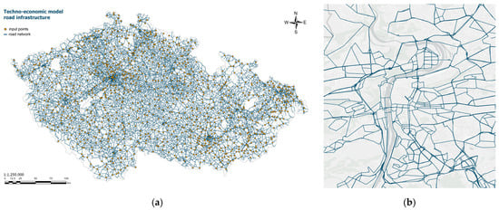 (a) Road infrastructure of the model (Czech Republic); (b) road infrastructure of the model (detail at city level).