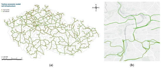 (a) Rail infrastructure of model (Czech Republic); (b) rail infrastructure of model (detail at city level).