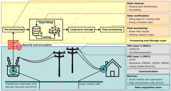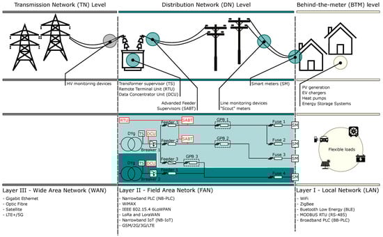 Transformer low-voltage supervisor (TS): Acting as a traditional three-phase smart meter, it provides additional insights into the aggregated power measurements in the radial-structured distribution network. Since the TS is closer than any other device to the MV/LV station, it often provides shorter response times for requests made by the DCU. In some cases, the TS and DCU are built into the same equipment, simplifying installation and data acquisition procedures with little to no latency.