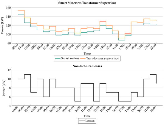 Figure 4), a simple representation of non-technical losses can be obtained. Fluctuations are expected, particularly when consumption is high, as power losses in cables are directly proportional to the circulating current. However, a significant mismatch could indicate metering malfunctions or even energy theft. These calculations can be performed automatically in the background as data are progressively received. When combined with an alarm system, different patterns for both malfunctions and fraud detection can be implemented, ensuring the system’s robustness.