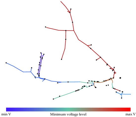 The calculated voltage values fluctuate throughout the day, enabling the identification of peak consumption periods and their specific locations. Since high power consumption results in a sharp voltage drop, a simple heatmap can be used to quickly identify areas with higher consumption, either due to customer habits or the presence of high-power flexible loads (such as EV chargers). Conversely, as power injection into the grid causes a local voltage rise, significant voltage deviations could indicate excessive PV energy generation.