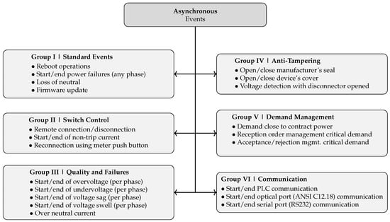 Voltage and current profiles can also be combined with asynchronous events reported by smart meters. These events are gathered once a week but provide valuable insights into switching control, quality measurements, and anti-tampering detection. With proper configuration, automated analytics can be performed by combining different data sources using the pre-defined PRIME reports sent by each smart meter. These devices can send various types of events, as shown in