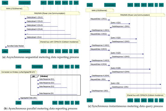 In a worst-case scenario, synchronous communication (e.g., when the DSO requests an instantaneous measurement from all smart meters through the DCU), as shown in