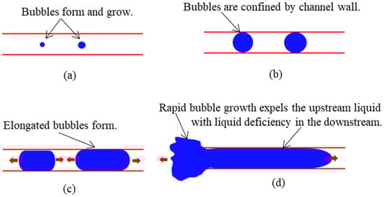 The critical heat flux represents another formidable challenge [14]. As illustrated in Figure 1, a plausible mechanism for CHF occurrence in microchannels is as follows: Once nucleated bubbles form within the microchannel (Figure 1a), they rapidly expand due to the applied heat. Constrained by the narrow dimensions of the microchannel, these bubbles quickly fill the entire cross section (Figure 1b). With the channel walls restricting further cross-sectional expansion, the bubbles are compelled to grow longitudinally, forming an elongated, narrow extended-bubble flow (Figure 1c). During this rapid expansion, the flow within the channel becomes unstable. In certain circumstances, the force exerted by the expanding bubbles can expel the upstream flowing liquid from the channel, resulting in a local liquid deficiency in the downstream section (Figure 1d). This deficiency, in turn, leads to a degradation in heat transfer efficiency, often accompanied by a significant increase in the microchannel surface temperature.