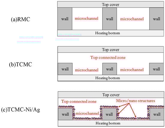 In the pursuit of augmenting the phase change heat transfer performance of top-connected microchannel heat exchangers, this paper introduces an innovative concept of a top-connected microchannel heat transfer structure integrated with a micro/nano composite surface structure. The underlying principle of this novel structure is elucidated in Figure 2. The top-connected microchannels (TCMC, shown in Figure 2b) are constructed by creating a transverse connection region between the top cover plate and the microchannels of regular parallel microchannels (RMC, as presented in Figure 2a). This design feature enables the interconnection of different microchannels at their upper ends. During the bubble growth process within the microchannels, this interconnection allows the gas–liquid interface to expand both along and perpendicular to the flow direction. Consequently, issues such as pressure imbalance and flow rate pulsation, which typically arise in regular channels due to the non-synchronous nucleation and growth of bubbles, are effectively mitigated.