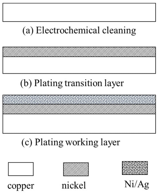 The Ni/Ag-TCMC variant was developed through surface modification using brush-plating technology [20], which involved three critical phases. As depicted in Figure 3, the process commenced with electrochemical cleaning to ensure optimal surface activation, followed by deposition of an intermediate transition layer to enhance coating adhesion. The final stage implemented controlled current density plating to establish a hierarchical Ni/Ag micro-nano composite structure across the TCMC surface. This multi-step approach enabled the creation of a functionally graded surface architecture while keeping the underlying microchannel geometry intact.