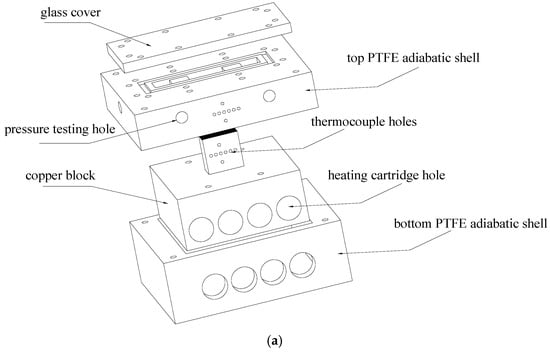 In Figure 4, the assembly drawing, physical diagram of the test section, and the cross-sectional view of the TCMC-type microchannel are comprehensively presented. To enable detailed visualization studies of the flow-pattern structures during flow boiling within the experimental section, the top cover plates of the microchannels are fabricated from high-purity, heat-resistant quartz glass. This material selection ensures both optical clarity for visualization and thermal stability under elevated operating conditions. The thermal energy required for the experiments is supplied by four precision electric heating cartridges, which are strategically embedded at the base of the copper block. These heating cartridges, with a diameter of 12 mm, a length of 64 mm, and a rated power of 220 W each, are designed to deliver uniform and controllable heat input to the test section. To optimize thermal management and minimize heat dissipation losses, the entire test section is encased in a polytetrafluoroethylene (PTFE) insulation layer. This PTFE casing not only reduces convective and radiative heat losses to the ambient environment but also ensures one-dimensional heat conduction along the vertical axis of the test section, thereby maintaining experimental consistency and accuracy.