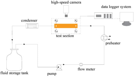 The experimental setup employed in this study is depicted in Figure 5. The working fluid housed within the liquid storage tank is expelled by a peristaltic pump. Subsequently, it traverses a flowmeter to quantify the flow rate, after which it is heated to a specific degree of sub-cooling by a pre-heater. The fluid then enters the experimental section, where heating induces a phase change heat transfer process. At the outlet of the experimental section, the generated steam is condensed by a condenser and subsequently returns to the liquid storage tank, thus completing a full cycle.
