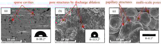 Surface structure morphology and contact angle. (a) Plain copper surface; (b) surface formed by laser ablation; (c) surface covered with Ni/Ag composite structures.