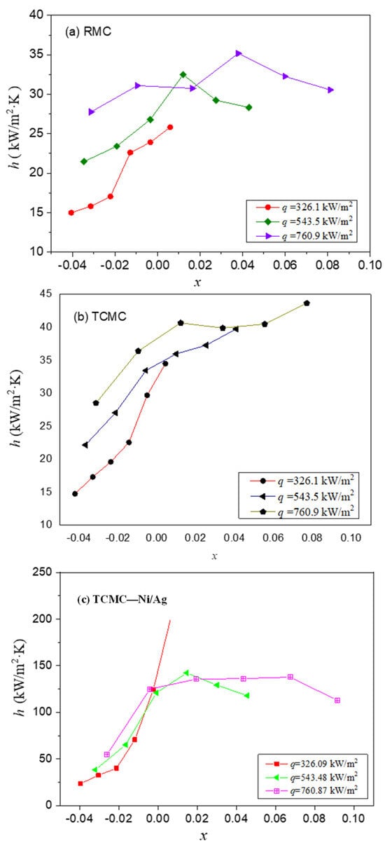 By comparing Figure 7a–c, it can be found that for RMC, the heat transfer coefficient generally shows an increasing trend when the heat flux density increases; for TCMC, when the vapor quality is small, the heat flux density has a significant impact on the heat transfer coefficient, and as the vapor quality increases, the impact of the heat flux density on heat transfer weakens; for TCMC-Ni/Ag, in the low-vapor-quality region where the vapor quality is less than zero, that is, corresponding to the subcooled boiling region, the heat flux density has a significant impact on the heat transfer coefficient, and as the vapor quality increases, the impact of the heat flux density on the heat transfer coefficient gradually weakens.