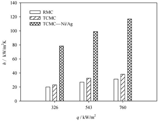 The average heat transfer coefficients havg of three types of microchannels, namely RMC, TCMC, and TCMC-Ni/Ag, were calculated and compared, and the results are shown in Figure 8. Within the selected typical operating conditions, the average heat transfer coefficients of the three types of microchannels all increase with the increase in heat flux density. When q = 760 kW/m2, the average heat transfer coefficients of RMC, TCMC, and TCMC-Ni/Ag reach their maximum values, which are 31.27 kW/m2·K, 38.28 kW/m2·K, and 116.98 kW/m2·K, respectively. Under the same operating conditions, the average heat transfer coefficient of TCMC is increased by a maximum of 22% compared with that of RMC, while the average heat transfer coefficient of TCMC-Ni/Ag is increased by a maximum of 2.9 times compared with that of RMC.