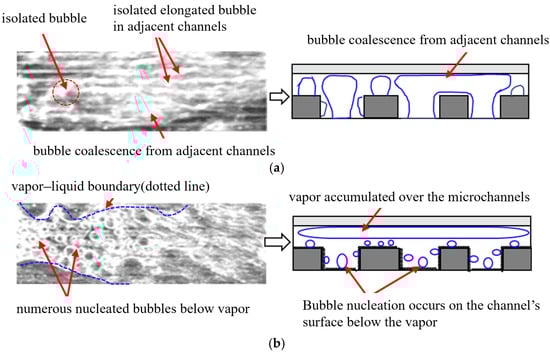 In order to disclose the mechanism underlying the enhanced flow boiling heat transfer within top-connected microchannels in detail, a visualization study of the flow patterns in these microchannels was carried out using a CMOS camera (XIMEA, XIQ, Münster, Germany). Figure 9a presents an image of the typical flow pattern structure within the TCMC. In the upstream microchannels and on the rib walls, relatively large nucleated bubbles are present, while in the downstream channels, elongated and narrow bubbles exist. Through observation, it was found that both isolated, elongated, and narrow bubbles and coalesced large bubbles co-exist between adjacent channels. However, the coalescence of bubbles is more prone to occur along the flow direction, thereby forming an elongated and narrow bubble flow (or long slug) within the channel. In contrast, the phenomenon of bubble coalescence between adjacent channels in the direction perpendicular to the flow is relatively infrequent.
