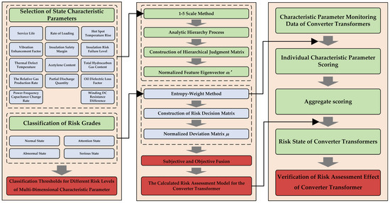 To address these issues, this study first establishes classification thresholds for different risk levels of the ‘electrical–thermal–mechanical’ multi-dimensional characteristic parameters in converter transformers based on relevant standards from the power industry and existing experimental research. Subsequently, the analytic hierarchy process is employed to construct a hierarchical judgment matrix based on the relative importance of these multi-dimensional parameters, deriving the maximum eigenvalue λmax and the corresponding normalized eigenvector ωj′. Concurrently, using the entropy-weight method and the classification thresholds for different risk levels of multi-dimensional characteristic parameters, a risk decision matrix is developed to obtain the normalized deviation matrix μj. Then, the AHP and entropy-weight method are integrated to create a risk assessment matrix model for converter transformers. Finally, the model’s effectiveness is validated using actual characteristic parameter monitoring data from converter transformers. The model development and validation framework are illustrated in Figure 1.