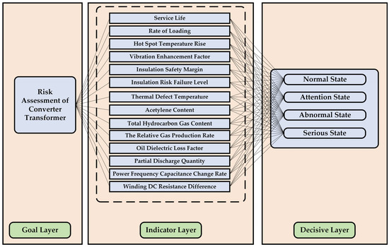 Firstly, the hierarchical structure of the evaluation system is established. When analyzing objects with multiple characteristics, it is essential to first construct the logical relationships for evaluating these objects. In the case of a redundant model without embedded features, the hierarchy is typically divided into three levels: the target level, the index level, and the decision level. Based on this logic, the hierarchical structure of the converter transformer risk assessment model is constructed, as shown in Figure 2.