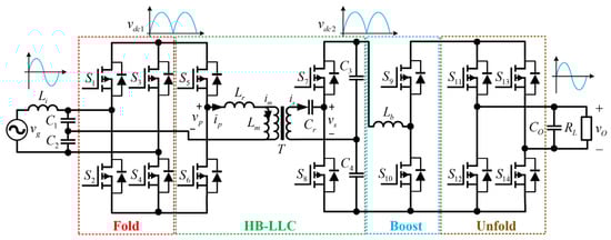 As illustrated in Figure 1, the proposed PET topology comprises a grid-side full-bridge rectifier, a half-bridge LLC resonant converter, a boost converter, and a load-side full-bridge inverter. The grid-side full-bridge rectifier (S1–S4) and load-side full-bridge inverter (S11–S14) operate at a line frequency, while the switches of the traditional AC-DC rectifiers and DC-AC inverters operate at high frequencies, resulting in high losses. Li represents the input filter inductor, which improves the input current quality. Cr denotes the resonant capacitor, while Lm and Lr correspond to the magnetizing inductance and resonant inductance, respectively. T represents the high-frequency transformer with a turn ratio of n:1. The filter capacitor of the input rectifier is shared as the primary-side half-bridge capacitor of the resonant converter. Similarly, the filter capacitor of the output inverter serves dual functions as the boost converter’s filter capacitor. Both the leakage inductance Lr and magnetizing inductance Lm are integrated into the transformer T.
