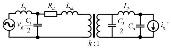 where k is related to the transformer ratio n and the LLC resonant converter unity gain. The equivalent circuit of the proposed PET topology under unity gain is shown in Figure 3. From (2) and Figure 3, this topology enables transient energy balance between the source and load. Although large capacitance helps suppress voltage ripple, it introduces excessive input reactive power and reduces power density. Thus, the filter capacitor selection requires consideration between the DC-link voltage ripple, input power factor, and power density.