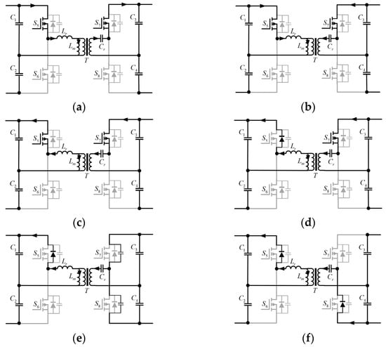 The half-cycle operational states of the resonant converter are illustrated in Figure 5a–j. At t0, energy transfers forward with Cr charging (Figure 5a). At t1, the secondary current ip reverses the polarity, while the primary current reversal occurs later at t2 due to the magnetizing inductance current (Figure 5b,c). Turning off S1 and S3 enables body diode conduction through secondary MOSFET drain-to-source capacitance Cds charging (Figure 5d,e). During t4–t5, a reverse voltage spans across to Lr, creating a current resonance peak (Figure 5f), causing primary current reversal and S6 body diode conduction after primary MOSFET capacitance charging (Figure 5g,h). ZVS is achieved when turning on S8 and S6 at t6 and t7, respectively (Figure 5i,j). And then enter the next cycle.