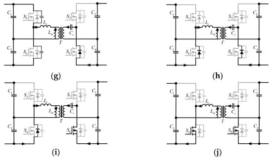 Operating state of the LLC series resonant converter. (a) t0–t1; (b) t1–t2; (c) t2–t3; (d) t3–t4; (e) t4; (f) t4–t5; (g) t5 (h) t5–t6; (i) t6–t7; and (j) t7–t8.