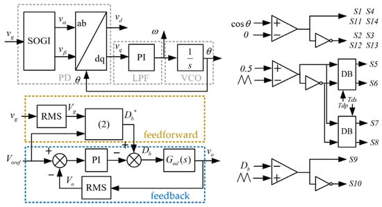 In power electronic transformers, in order to accurately control the voltage and current waveforms of the system, it is necessary to dynamically obtain the phase information of the grid voltage. Therefore, a phase-locked loop (PLL) is used in this paper. As shown in Figure 6, the phase detector (PD) based on SOGI [] compares the output phase θ with the input signal vg in terms of the phase, generating an error voltage vq corresponding to the phase difference between the two signals. The error voltage is through a PI controller (as a low-pass filter, LPF) to produce the frequency for the integrator (as a voltage-controlled oscillator, VCO). When there is a phase difference between the output and input signal, for example, the output phase leads to the input phase, the PD outputs a negative error vq. Then, the frequency output by the PI controller is reduced, thereby reducing the leading phase. And a positive error vq occurs when there is a phase lag until the phase difference is adjusted to 0. After obtaining the phase information of vg, the input rectifier S1, S2, S3, and S4 and the output inverter S11, S12, S13, and S14 will switch their states at the zero-crossing point, as shown in Figure 6.
