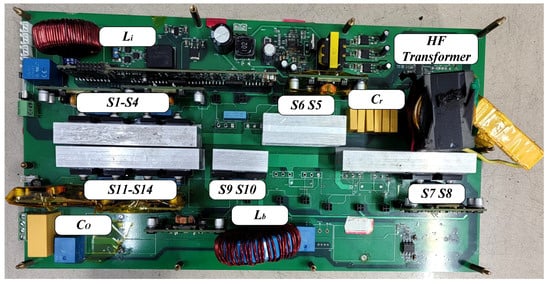 In this section, a 1kW PET prototype was developed and tested. The switching frequency of the LLC converter is 65 kHz, while 20 kHz is the Boost converter, achieving a balance between the smaller-sized passive components and the greater losses at a high switching frequency. Then, the resonant inductance (6.4 μH) and resonant capacitance (0.9 μF) are designed with (2). The filter is designed according to the ripple requirements, and the magnetizing inductance is set at 320 μH for the ZVS condition (7). In the 1kW PET prototype, a PQ5050 Core is used, as shown in Table 1. The prototype of the proposed PET is shown in Figure 7, and the system experimental parameters are presented in Table 2.