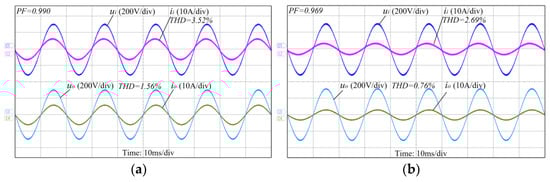 Figure 8 shows the input and output waveforms of the PET under the rated load and half-load conditions. The input and output voltages and currents are all smooth sinusoidal waves. Due to the filter capacitors on the bus of the system, the input current is slightly ahead of the input voltage, which is mainly caused by the capacitive reactive power of the bus capacitors. The power factor of the PET under-rated load was measured to be 0.99, with 3.52% THD of the input current and 1.56% of the output voltage. In summary, the proposed PET can generate a sinusoidal input current and a controllable output voltage.