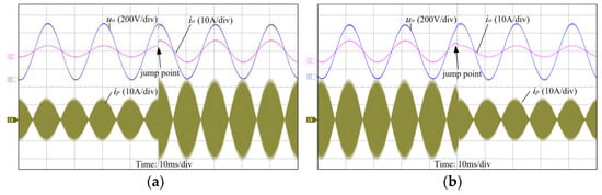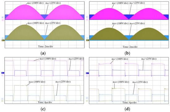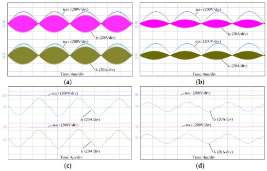Figure 9 shows the steady-state working waveforms of the LLC resonant converter under rated load and half-load conditions. As shown in Figure 9a,b, the primary rectifier and the secondary inverter operate according to the polarity of the input voltage and generate fold sine waves with the same phase on the DC-link. The high-frequency transformer and the primary current present a sinusoidal envelope in the fold sine wave voltage. Figure 9c,d are magnified views near the peak of the bus voltage. The resonant current is approximately sinusoidal, and its amplitude is related to the load. At the same time, there is a small negative resonant peak near the zero-crossing point, consistent with the previous statement in Figure 4.