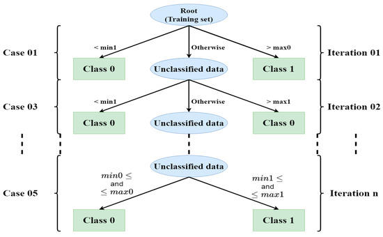 - The algorithm iterates through steps (c) to (e) until all data are classified (case 5) or the stopping criterion is met. It employs early stopping as its stopping criterion to effectively mitigate overfitting without compromising the accuracy of the algorithm [40,41,42]