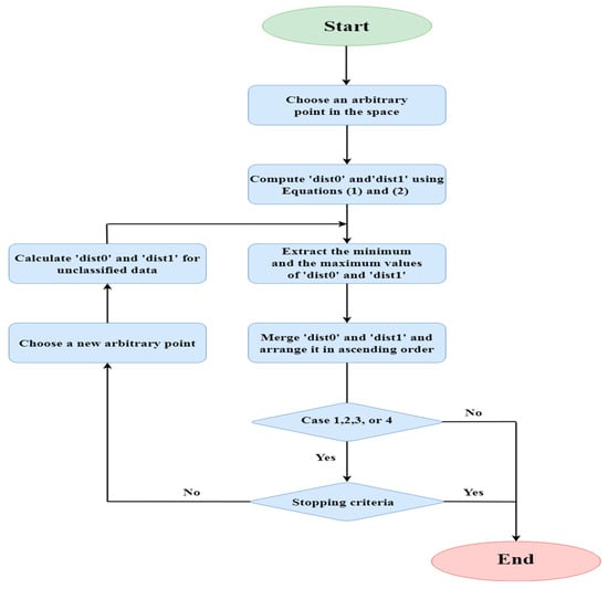 | STEP (a): Generate a random point. STEP (b): Using Equations (1) and (2), calculate the distances and . STEP (c): Find , the minimal and maximal distances of each class. STEP (d): Store the computed di-stances int a vector named and organize it in ascending order. STEP (e): (the counter for unclassified data) - If For to () If The point associated to belongs to elseif The point associated to belongs to Else () Increment End if END for . if the stopping criteria is not verified Choose a new arbitrary point. Calculate the distances and for unclassified data. Go to step (c). Else Go to step (f). End if Elseif For to If The point associated to belongs to elseif The point associated to belongs to Else () Increment End if END for . if the stopping criteria is not verified Choose a new arbitrary point. Calculate the distances and for unclassified data. Go to step (c). Else Go to step (f). End if. Elseif For to If or The point associated to belongs to Else () Increment End if END for . if the stopping criteria is not verified Choose a new arbitrary point. Calculate the distances and for unclassified data. Go to step (c). Else Go to step (f). End if. Elseif For to If or The point associated to belongs to Else () Increment End if END for . if the stopping criteria is not verified Choose a new arbitrary point. Calculate the distances and for unclassified data. Go to step (c). Else Go to step (f). End if. Else (() or ()) For to If The point associated to belongs to If The point associated to belongs to END for Go to step (f) End if Step (f): End (all data are classified or the stopping criterion is met). |