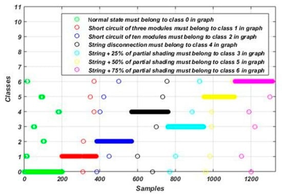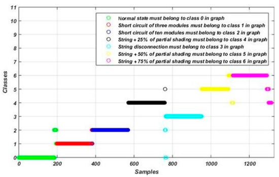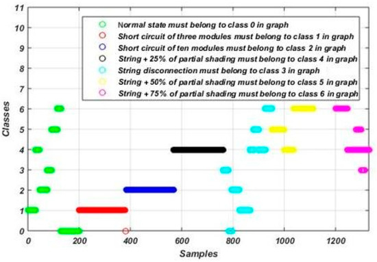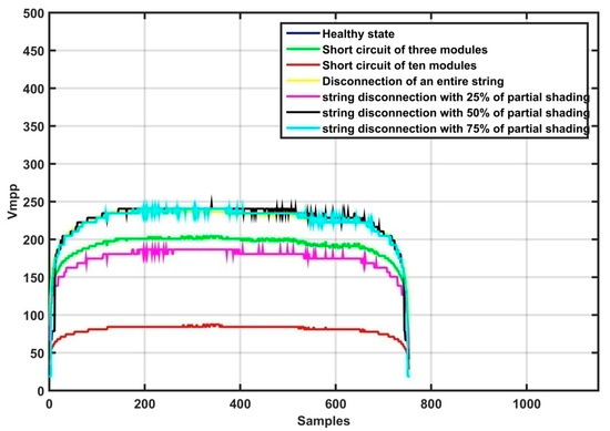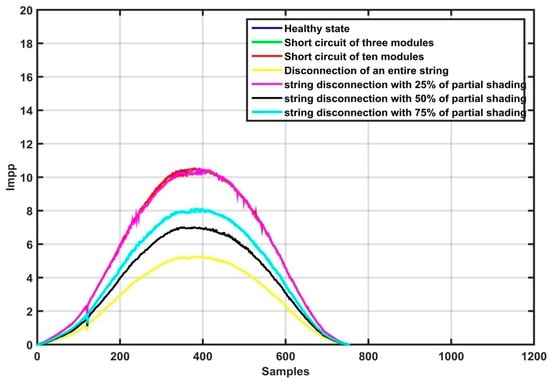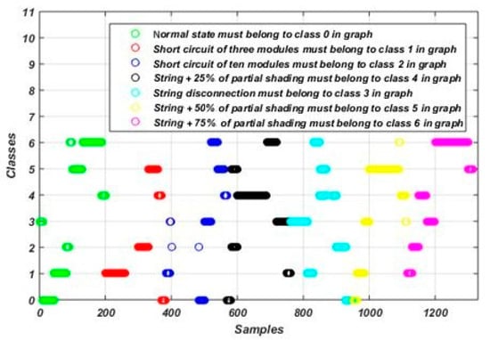 As shown in Figure 8, utilizing the Impp as a feature makes it possible to distinguish between three faults: string disconnection, string disconnection with 50% shading, and string disconnection with 75% shading. Meanwhile, in Figure 9, it appears that the Vmpp feature can be used to classify faults such as string disconnection with 25% shading, short circuits of three modules, and short circuits of ten modules. To detect the healthy state class, both Impp and Vmpp features must be used simultaneously.