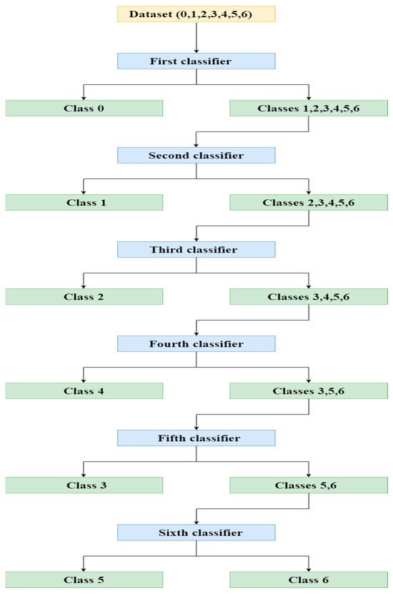 The flowchart of the classification strategy used is shown in Figure 10. In order for the algorithm to function effectively, the multi-class dataset must be adapted to a bi-class dataset by isolating one class at a time, starting from class 0 and going up to class 6. Therefore, six classifiers must be designed for this purpose.
