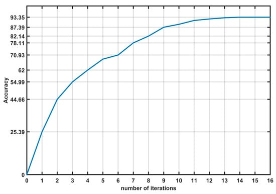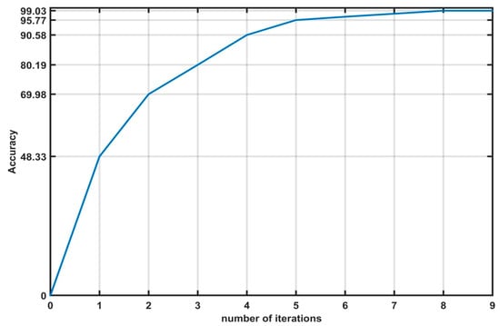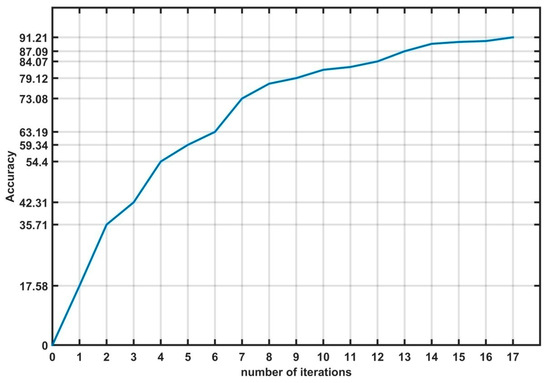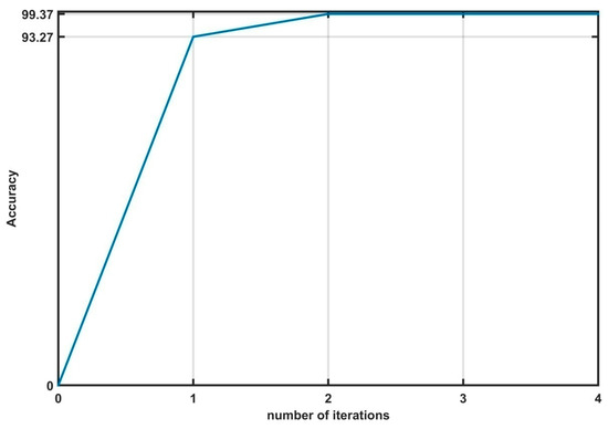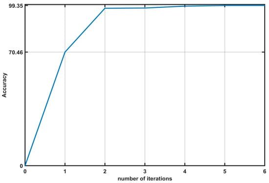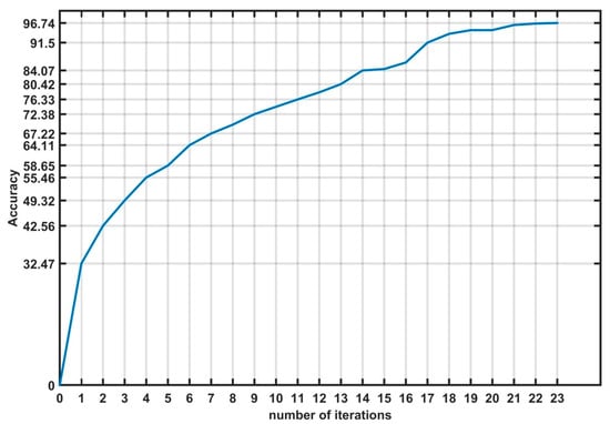 The accuracy metric for each classifier is calculated at every iteration and illustrated in Figure 11, Figure 12, Figure 13, Figure 14, Figure 15 and Figure 16. As can be seen, for all classifiers, the accuracy value increases over iterations. Classifiers 1 to 6 of the trained model require 23, 9, 4, 6, 16, and 17 steps, respectively, to separate a class from the other classes.