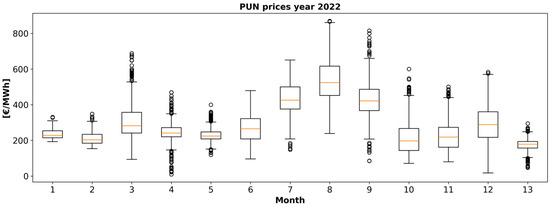 As far as electricity prices for Italian domestic clients are concerned, the selling price follows the “Ritiro Dedicato” [34] scheme, where electricity injected into the grid is sold at the zonal price, “Prezzo Zonale” (PZ). Regarding the purchase price, due to transport costs and taxes, it is about twice the market clearing price, known as “Prezzo Unico Nazionale” (PUN) in Italy. It is worth noting that PZ and PUN are typically quite similar, differing only when market splitting occurs in the day-ahead market (DAM) resolution [35], particularly in the north bidding zone. In normal socio-economic conditions, the PUN (thus the electricity selling and purchasing prices) can be day-ahead forecasted with 15–20% mean absolute percentage error (MAPE) error [36] using support vector machine algorithms. However, during the EMS testing period, which ranges from 28 January 2022 until 28 January 2023, electricity prices were very volatile as a consequence of geopolitical tensions, when minimums around 20 €/MWh and peaks up to 870 €/MWh were recorded (see Figure 3). Therefore, instead of developing a forecasting module, historical data for purchase and selling prices have been considered, which were available from [37]. Future testing activities of the EMS, hopefully in stable geo-political periods, will also include the price forecast module.