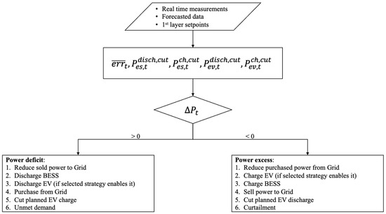 Depending on whether is positive or negative, the system must address either a power deficit or a power surplus. Figure 4 presents a block-flow diagram of the second-layer heuristic strategy, detailing the priority order for managing these scenarios: